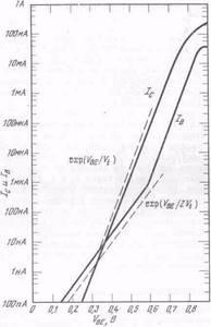 В этом асимптотическом выражении значение параметра п обычно лежит в диапазоне от 1 до 2. Более того, значение параметра Iо превышает значение соответствующего множителя в экспоненциальном выражении, описывающем данную зависимость в средней части диапазона напряжений смещения эмиттерного перехода.