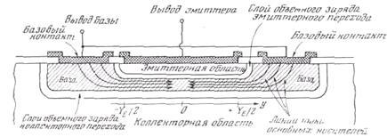 Поэтому плотность инжектированного электронного тока снижается от своего максимального значения, которое имеет место на участке активной области, ближайшем к базовому электроду, до своего минимального значения в центре эмиттера. Это вытеснение тока к периметру эмиттера увеличивается с ростом напряжения смещения и вызывает локальный перегрев структуры уже при таких токах, которые были бы вполне допустимы в случае равномерного распределения тока в ней. Эффекты высокого уровня инжекции, рассмотренные в начале данного раздела, тоже проявляются при меньших значениях тока, что объясняется неравномерным распределением плотности тока в активной области транзистора. Для снижения сопротивления базы в мощных транзисторах базовые и эмиттерные контакты делаются в виде больших совмещенных гребенчатых структур.