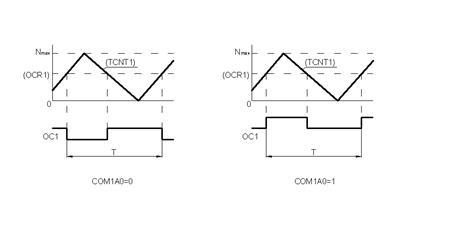 При записи байта в регистр OCR2 (по команде с мнемокодом операции OUT) байт принимается в регистр временного хранения, из регистра которого переписывается в регистр OCR2 при появлении в базовом счетчике кода числа 255. При этом исключается появление в сигнале PWM импульса со случайной длительностью.