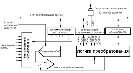 Аналого-цифровой преобразователь входит в состав периферийных устройств микроконтроллеров типа t15, 4433, 8535, m163 и m103. Аналого-цифровой преобразователь содержит базовый преобразователь, выполняющий преобразование аналогового сигнала в десятиразрядный двоичный код методом последовательных приближений, аналоговый мультиплексор для подключения одного из входов микроконтроллера к входу базового преобразователя, регистр управления ADMUX, регистр управления-состояния ADCSR и шестнадцатиразрядный регистр результата ADCH, L.
