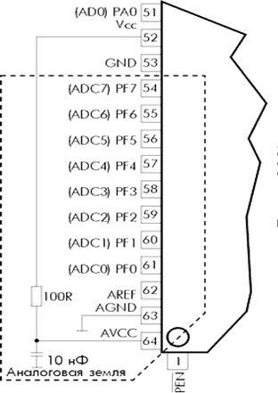 Для подачи напряжения питания и опорного напряжения используются отдельные выводы микроконтроллера AVCC, AGND и AREF.