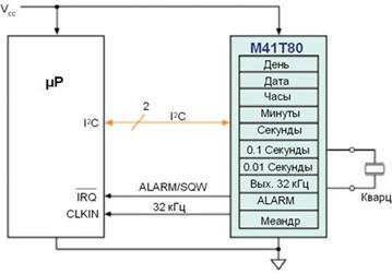 В дополнение к основной задаче хронометрирования, в микросхеме M41T0 есть опция стопового бита генератора для обнаружения ухода частоты тактового генератора из-за уменьшения питающего напряжения. Что касается M41T80, его свойства хронометрирования дополнены программируемым прерыванием по сигналу Alarm с режимами повтора, специальным выводом частоты 32 кГц и программируемым выходным меандром с частотой от 1 Гц до 32 кГц. Специализированный вывод частоты 32 кГц может использоваться для управления микропроцессорами и микроконтроллерами со схемой фазовой синхронизации тактового генератора, которая требует 32 кГц в качестве эталона. Кроме того, этот же вывод может использоваться для тактовой синхронизации микросхем при их работе на режимах с малой мощностью. Вывод 32 кГц рассчитан для условий постоянной работы, но он может быть заблокирован программным обеспечением пользователя.