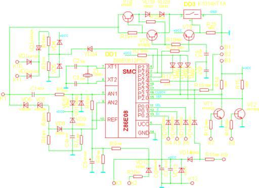 Схема работает по принципу активизации процессора в момент внешнего воздействия и пребывания его в режиме пониженного энергопотребления (режим STOP) в остальных случаях. Для вывода процессора из режима STOP служит сигнал логического 0 на выводе P2.7. Если на этом выводе сохраняется логический 0, то процессор не переходит в режим STOP. Активизация процессора вызывается следующими ситуациями: нажатие клавиши CLOCK или SET, падение напряжения в линии ниже уровня 20 В. Таким образом процессор активизируется после поступления звонка, при снятии трубки или просто при отключении от линии, вследствии чего при питании от батарей телефон не следует оставлять надолго отключенным от линии из-за достаточно большого тока потребления в активном режиме. Датчиком напряжения линии служит цепь собранная на элементах VD1, VD2, VD3, R1, R2, VD4, VD5, VD24. На элементах R21, VD21, VD22, VD23 собрано логическое.