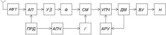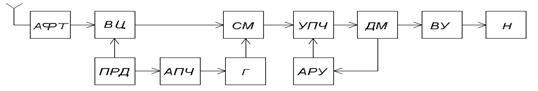Структурная схема приемника с однократным преобразованием частоты: АФТ - антенно-фидерное устройство; ВЦ - входная цепь; СМ - смеситель; Г - гетеродин; ДМ - демодулятор; Н - нагрузка; АРУ - автоматическая регулировка усиления; АПЧГ - автоматическая подстройка частоты гетеродина; ПРД - передатчик.