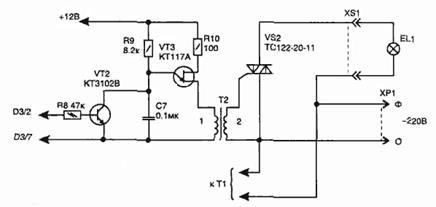 Индикатором срабатывания последнего триггера (D3.2) является свечение светодиода HL1. Оптронный ключ VS1 обеспечивает электрическую развязку блока управления от сети 220 В, что позволяет получить хорошую устойчивость схемы к помехам.
