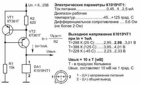 VT1, VT2, R1, R2 - вхідна схема термодатчика. Ця схема забезпечує на вході термодатчика постійний струм 1 мА.