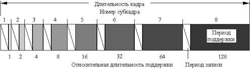 где n - число строк в панели, Tc - длительность строки. Для характерных значений Tk = 16 мс, n = 480, Tc = 3 мкс, получим N = 11. Так как этого количества явно недостаточно для получения качественного изображения, то во всех современных PDP для управления яркостью используется эффект памяти. В этом случае кадр изображения разбивается на 8 субкадров с различной длительностью поддержки, соответствующим 8 битовым плоскостям, как это показано на рис. 2.3