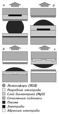 Атомы люминофора испускают фотоны в произвольном направлении. По условию задачи требуется, чтобы фотоны испускались преимущественно в сторону зрителя. По этой причине и было решено "перевернуть" ячейку, как показано на рис. г. Адресный электрод вместе с основной функцией проводника выполняет и вторую - зеркала, отражающего половину света, излучаемого люминофором, в сторону зрителя. Разрядные электроды приобрели выступы, более компактно локализующие разряд.