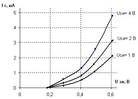 На рисунке 2.1 построено семейство передаточных характеристик транзистора для значений напряжения между стоком и истоком 1, 2, 4 В.