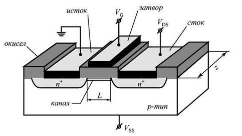 Термин «МДП-транзистор» используется для обозначения полевых транзисторов, в которых управляющий электрод - затвор отделен от активной области полевого транзистора диэлектрической прослойкой – изолятором. Основным элементом для этих транзисторов является структура металл–диэлектрик–полупроводник. По этой причине в названии транзистора используется аббревиатура МДП. Монокристаллический полупроводник n- или p-типа, на котором изготавливается МДП-транзистор, получил название подложки. Две сильнолегированные области противоположного с подложкой типа проводимости получили названия истоки сток. Область полупроводниковой подложки, находящаяся под затвором между истоком и стоком, называется каналом. Диэлектрический слой, расположенный между затвором и каналом, получил название подзатворного диэлектрика. В качестве полупроводниковой подложки в большинстве МДП-транзисторов используется GaAsи подзатворный диэлектрик. По этой причине как синоним для МДП-транзисторов применяется термин «МОП-транзистор». Канал в МДП-транзисторах может быть как индуцированным, так и встроенным [7].