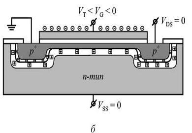 такого знака, чтобы на поверхности полупроводника сформировался инверсионный слой. Для n-канального транзистора (полупроводниковая подложкаp-типа) знак напряжения VG