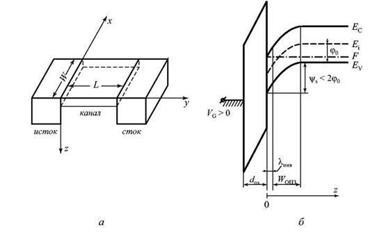 Физической основой работы полевого транзистора со структурой металл–диэлектрик–полупроводник является эффект поля. Эффект поля состоит в том, что под действием внешнего электрического поля изменяется концентрация свободных носителей заряда в приповерхностной области полупроводника. В полевых приборах со структурой МДП внешнее поле обусловлено приложенным напряжением на металлический электрод - затвор. В зависимости от знака и величины приложенного напряжения могут быть четыре состояния области пространственного заряда (ОПЗ) полупроводника – обогащение, обеднение, слабая и сильная инверсия. Полевые транзисторы в активном режиме могут работать только в области слабой или сильной инверсии, т. е. в том случае, когда инверсионный канал между истоком и стоком отделен от квазинейтрального объема подложки областью обеднения [11].