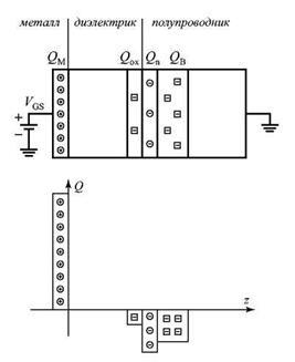 Если зарядить одну из обкладок МДП конденсатора - затвор, то на второй - полупроводниковой обкладке должен появиться заряд равный по величине и противоположный по знаку, который будет связан с поверхностными состояниями, ионизованными атомами примеси и свободными носителями заряда.
