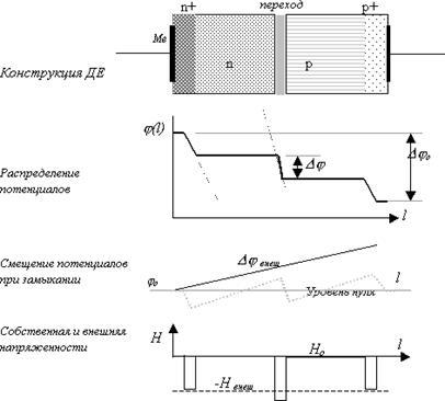 В отличии от существующей теории мы рассматриваем векторы напряженностей, а не разностей потенциалов. Это оказывается решающим фактором для независимого анализа группы параллельных диодов, поскольку появляются участки с противоположным направлением напряженности. На рис. 35 схематично изображен ДЕ, в котором дополнительные переходы объединены в один. Теперь анализ работы ДЕ распадается на несколько частей: состояние основного и дополнительного переходов, а также включения или выключения паразитных режимов. Число сочетаний режимов 4-х диодов становится большим, поэтому анализ работы диода проводим раздельно.