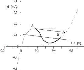 Нагрузочная линия задает наклон переключения рабочей точки диода. В прямом направлении переключение показано стрелкой из точки А, в обратном – выбор происходит автоматически в момент равенства динамического сопротивления диодов.