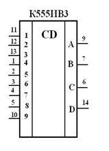 По условию задания, к курсовому проекту заданы ИМС серии ТТЛ типа КМ 555. Выберем ИМС типа КМ555ЛИ1, содержащую четыре элемента 2И, и КМ555ЛН2, содержащую шесть элементов НЕ, и КМ555ЛЛ1, содержащую четыре элемента 2ИЛИ, рис 2.12: