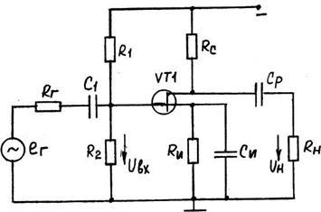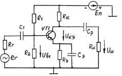 Упрощенная схема каскада, выполненного на биполярном транзисторе типа р-n-р, включенного по схеме ОЭ, приведена на рисунке 1. На схеме обозначены: R1
