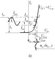 В связи с этим построение линии нагрузки каскада по постоянному току удобно провести по двум точкам, характеризующим режим холостого хода (точка ) и режим покоя (точка ) выходной цепи каскада (рис. 3, а). Для точки ”а” , и для точки ” ” , , где выбирают из условия работы транзистора в режиме отсечки  напряжение на коллекторе, соответствующее области нелинейных начальных участков выходных характеристик транзистора. Определив координаты точки находим значение тока базы , соответствующего режиму покоя, и определяем координаты точки на входной характеристике (рис. 3, б).