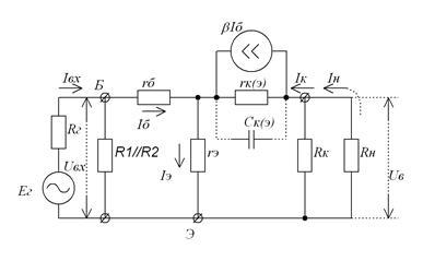 При определении переменных составляющих выходного напряжения каскада и коллекторного тока транзистора используют линию нагрузки каскада по переменному току. При этом необходимо учесть, что по переменному току сопротивление в цепи эмиттера транзистора равно нулю, так как резистор шунтируется конденсатором , а к коллекторной цепи подключается нагрузка, поскольку сопротивление конденсатора по переменному току мало. Если к тому же учесть, что сопротивление источника питания по переменному току также близко к нулю, то окажется, что задача определения этих показателей решается при расчете усилительного каскада по переменному току. Метод расчета основан на замене транзистора и всего каскада его схемой замещения по переменному току. Схема замещения каскада ОЭ приведена на рис. 4, где транзистор представлен его схемой замещения в физических параметрах. Сопротивление каскада по переменному току определяется сопротивлениями резисторов и , включенных параллельно, т. е. ║ . Сопротивление нагрузки каскада по постоянному току больше, чем по переменному току ║ .