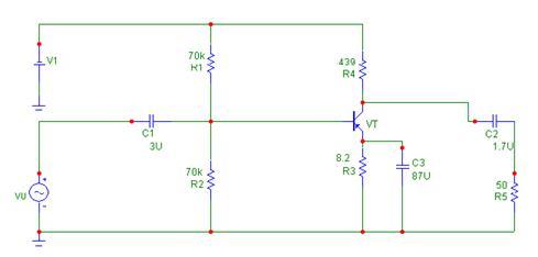 Принципиальная электрическая схема усилителя с рассчитанными параметрами элементов с помощью программы "Microcap"