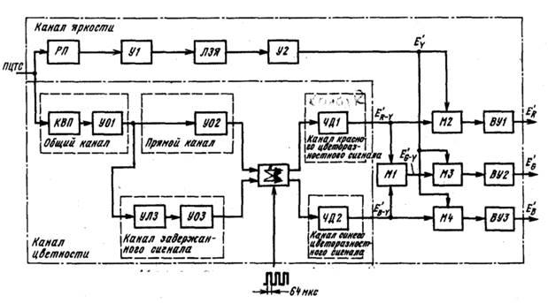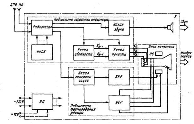 Для управления служит УУ, формирующее напряжения для коммутации, настройки и регулировки. Каналы цветности обеспечивают подачу на катоды кинескопа 3 первичных сигнала цветности. Для формирования растра необходимы КС, БКР, БСР. В состав канала звука входят УПЧ, ЧД, УНЧ. Каналы цветности и яркости обеспечивают подачу на катоды цветного кинескопа 3-х первичных сигналов цветности.