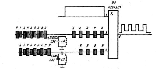 На другой вход (вывод 3) подаются импульсы, соответствующие «красным» строкам, которые из сигналов цветовой синхронизации выделяются колебательным контуром 1.8С38. На третий вход (вывод 9) поступают сигналы, соответствующие «синим» строкам, которые выделены из задержанных на время одной строки сигналов цветовой синхронизации контуром L7C37.