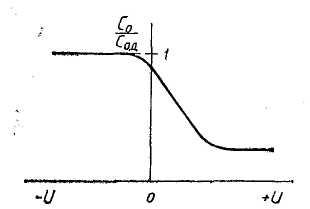 Рассмотренная зависимость емкости МДП-конденсатора на частотах выше 100 Гц от напряжения (вольт-фарадная характеристика) иллюстрируется Рисунок 3.1.2. Как видно из рисунка, при отрицательных напряжениях на металлическом электроде (для полупроводника р-типа) удельная емкость определяется емкостью окисла, при значительных положительных напряжениях — емкостью пространственного заряда инверсионного слоя в полупроводнике, при промежуточных значениях напряжения она изменяется согласно соотношению (1.5).