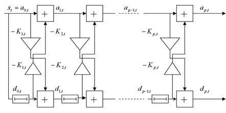 т.е. взвешенным суммированием ошибок обратного предсказания в предшествующий момент времени с коэффициентами веса, равными коэффициентам отражения. Случайная величина хt