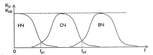 Рис. 1.1. Амплітудно-частотні характеристики передавальної функції каналів багатосмугової акустичної системи