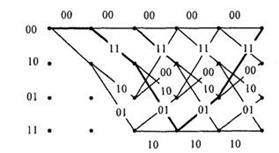 Кодові грати цього коду показані на мал. 1.1. При його складанні враховано, що кодер містить пам'ять у вигляді дворозрядного регістра. Кожному з чотирьох можливих станів цього регістра відповідає один з чотирьох вузлів решітки. Тому лівий символ в позначенні вузла дорівнює останньому інформаційному біту, вже записаному в регістр. При записі в регістр чергового інформаційного символу регістр міняє стан на одне з двох сусідніх. Цей перехід позначений ребрами грат. Порядок вузлів вибраний таким, що при нульовому поточному інформаційному символі (а=0) перехід в наступний стан відповідає верхньому ребру, а при = 1 - нижньому.