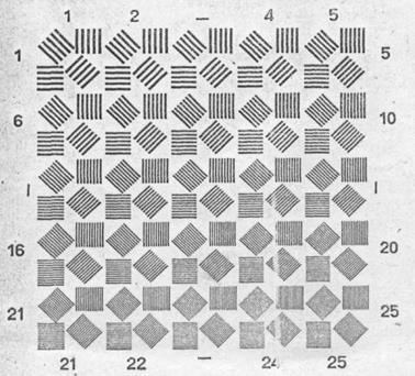 Для определения предела разрешения объектива в фокальную плоскость коллиматора устанавливают штриховую таблицу-миру (рис. 9) состоящую из черно-белых штрихов, нанесенных фотопутем па стеклянной пластинке. Ширина штриха зависит от размера миры.