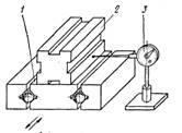 1. Устанавливают лекальную линейку 2 на плоскость перемещающейся детали 1 параллельно ее ходу. При этом лекальную линейку закрепляют мастикой. Чувствительный элемент 3 индикатора приводят в соприкосновение с линейкой.