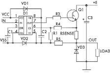 Описаний спосіб включення транзистора має свої недоліки. Резистор RSENSE повинен бути достатньо могутнім і мати над малу індуктивність. Виті могутні резистори, що серійно випускаються, звичайно мають неприпустимо високу паразитну індуктивність. Спеціально для прецизійного вимірювання імпульсних струмів фірма CADDOCK випускає резистори в корпусах ТЕ-220 і ТЕ-247. Крім того, вимірювальний резистор створює додаткові втрати потужності, що знижує ефективність схеми. На рисунку 6 приведена схема, вільна від вказаних недоліків. У ній для аналізу ситуації перевантаження використовується залежність напруги насичення від струму колектора. Для MOSFET транзисторів ця залежність практично лінійна, оскільки опір відкритого каналу мало залежить від струму стоку. У IGBT графік Von = f(Ic) нелінійний, проте точність його цілком достатня для вибору напруги, відповідної струму вимагається захисту.