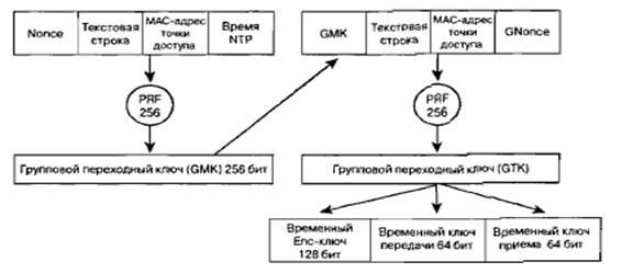 Груповий майстер – ключ, рядок тексту, МАС – адреса точки доступу і Gnonce (значення, яке береться із лічильника ключа точки доступу) об’єднуються і обробляються з допомогою PRF, в результаті отримуємо 256 – розрядний груповий перехідний ключ (GTK). GTKділиться на 128 – розрядний ключ шифрування широкомовних/багатоадресних фреймів, 64 – розрядний ключ передачі МІС і 64 – розрядний ключ прийому МІС. З допомогою цих ключів широкомовні і багато адресні фрейми шифруються і дешифруються точно так же, як з допомогою одно адресних ключів, отриманих на основі парного майстер – ключа (РМК).