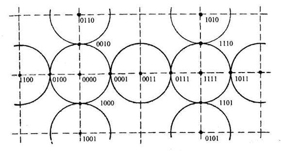 На рисунку 1 приведена геометрична модель найпростішого коригувального коду (4, 3) з парним числом одиниць, представлена на площині, де всі дозволені КК зображені у виді крапок, що є центрами окружностей з радіусами d =