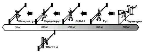 Інфрачервоні бар'єри будують із застосуванням активних інфрачервоних оповічувачів| з передавачами, що рознесли, і приймачами. Прикладом активних систем виявлення служать активні | оповічувачі| серії АХ і стійки серії REDNET RN фірми Optex і стійки Perimbar фірми Radiovisor. Принцип їх дії полягає в наступному. Передавач випромінює електромагнітний потік діапазону - невидимий промінь, який прямує у бік приймача. У відсутність перешкод на шляху променя приймач сприймає його і перетворить в електричний сигнал. Зміна інтенсивності променя, що приймається, при спробі його перетину детектує і аналізується процесором приймача [5].Для створення бар'єру групу передавачів і приймачів вбудовують в стійку, розміщуючи їх на різній висоті .