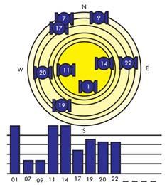 сферы видно не более восьми, а сигналы принимаются максимум с четырех-шести. Закрашенный столбик над номером спутника показывает на устойчивый прием сигналов, а высота столбца позволяет оценить качество приема. В момент, когда GPS-навигатор начинает получать информацию со спутника, над его номером появляется не закрашенный прямоугольник. Закрашивается он при уточнении параметров орбиты спутника и начале получения данных, на основе которых идет непосредственный расчет координат пользователя.