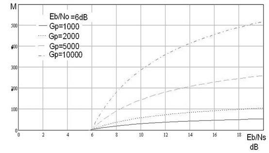 Зависимость числа одновременно действующих каналов М ШПСС от значения отношения сигнал/шум Eb