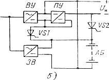 В ЭПУ, построенной по схеме на рисунок 2,б, стабилизация выходного напряжения при разряде АБ производится с помощью стабилизирующего преобразовательного устройства (вольтодобавочного) ПУ. Принципиально возможно стабилизировать выходное напряжение и при нестабилизирующем выпрямительном устройстве ВУ. При отключении электроснабжения или аварии в ВУ включается тиристор VS1 и питание аппаратуры осуществляется от разряжающейся АБ и ПУ при стабильном напряжении. Заряд и содержание АБ производится от зарядного выпрямителя 3В. Тиристор VS2 подключает АБ к нагрузке в случае понижения напряжения на ней, что может иметь место при переходных процессах в системе. Рассмотренная система выгодно отличается от буферной (рисунок 1, г) меньшими потерями энергии и большей перегрузочной способностью и может быть рекомендована для питания станций с программным управлением.