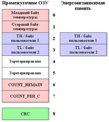 Кроме ПЗУ DS18S20 имеет промежуточное ОЗУ объемом 8 байт, плюс два байта энергонезависимой памяти. Карта памяти DS18S20 показана на рисунке: