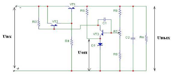 Начертить принципиальную электрическую схему стабилизатора напряжения.