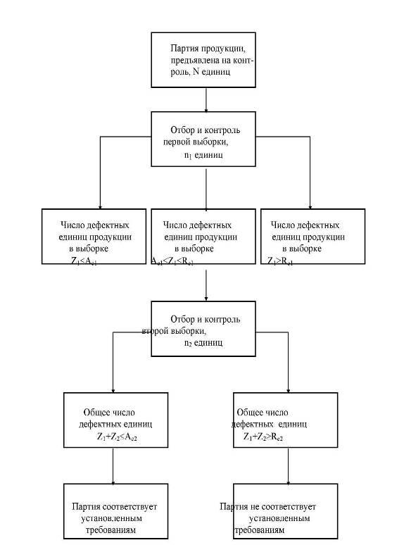 Двухступенчатый план выборочного контроля характеризуется тем, что решение относительно приемки партии продукции принимают по результатам контроля не более двух выборок, причем необходимость отбора второй выборки зависит от результатов контроля первой выборки.