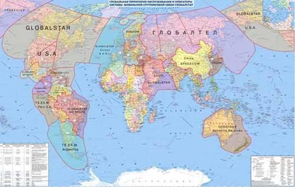 За допомогою низькоорбітальних супутників Глобалстар забезпечує зв'язком абонентів, що виїжджають за межі дії стільникових систем і як і раніше бажаючих користатися звичними послугами. Нижче (рис.1) показана зона обслуговування супутникової мережі Глобалстар.