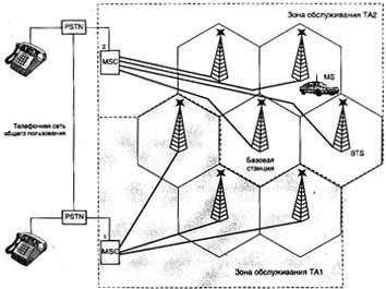 Центр комутації мобільного зв'язку забезпечує керування системою мобільного радіозв'язку і є сполучною ланкою між мобільними станціями і телефонною мережею загального користування. Кожен MSC обслуговує групу базових станцій, сукупність яких утворює його зону обслуговування (на рис. 1.1 зони обслуговування виділені сірим кольором).