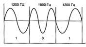 У системі мобільного зв’язку NMT для обміну службовою інформацією між MSC, BTS і MS, крім службових сигналів, що визначають канали керування і розмовні канали, використовуються сигнали, що визначають зону обслуговування, країну, у якій знаходиться мобільний абонент, а також сигнали, що позначають номер каналу. Усі ці службові сигнали є цифровими і формуються за допомогою швидкої частотної маніпуляції FFSK (Fast Frequency Shift Keying). Принцип формування FFSK сигналу представлений на рис. 1.2. З цього рисунка видно, що цифровий сигнал, визначений як логічна одиниця, являє собою один період коливання частотою 1200 Гц, а сигнал логічного нуля - 1,5 періоду коливання частотою 1800 Гц. Таким чином, можна сказати, що цифровий сигнал передається по каналу зв'язку зі швидкістю 1200 біт/с.