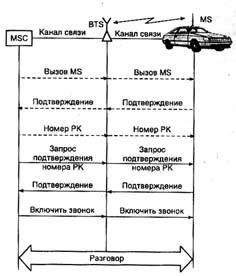 Протокол установлення вхідного виклику в системі NMT побудований у такий спосіб. У початковому стані мобільна станція MS налаштована на частоту канала керування, що має максимальний рівень сигналу. Виклик абонента відбувається центром комутації MSC через усі базові станції BTS, що відносяться до так називаної зони виклику, у якій розташований мобільний абонент у даний момент часу (рис. 1.4).