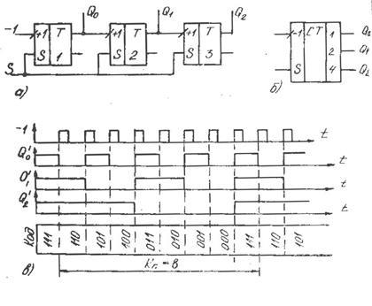 Иллюстрирующий пример трехразрядного суммирующего счетчика с временными диаграммами работы и условным изображением приведен на рис. 1. Счетчик может принимать 8 различных состояний, которые повторяются через каждые 8 входных импульсов (Kn