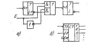 Из правила прибавления к двоичному числу единицы также известно, что изменение значения i-го разряда происходит тогда, когда до прибавления очередной единицы все предыдущие разряды были единицами. Отсюда следует правило: если триггеры имеют прямой счетный вход, то он подключается к инверсному выходу предыдущего триггера; если имеет инверсный вход, то он подключается к прямому выходу.