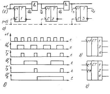 Рисунок 1 – схема (а), условное графическое обозначение (б) ивременные диаграммы трехразрядного суммирующего счетчикас последовательным переносом.