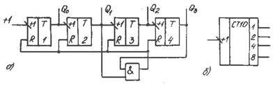 На рис. 5 приведен пример декадного (двоично-десятичного) счетчика с исключением старших избыточных состояний.
